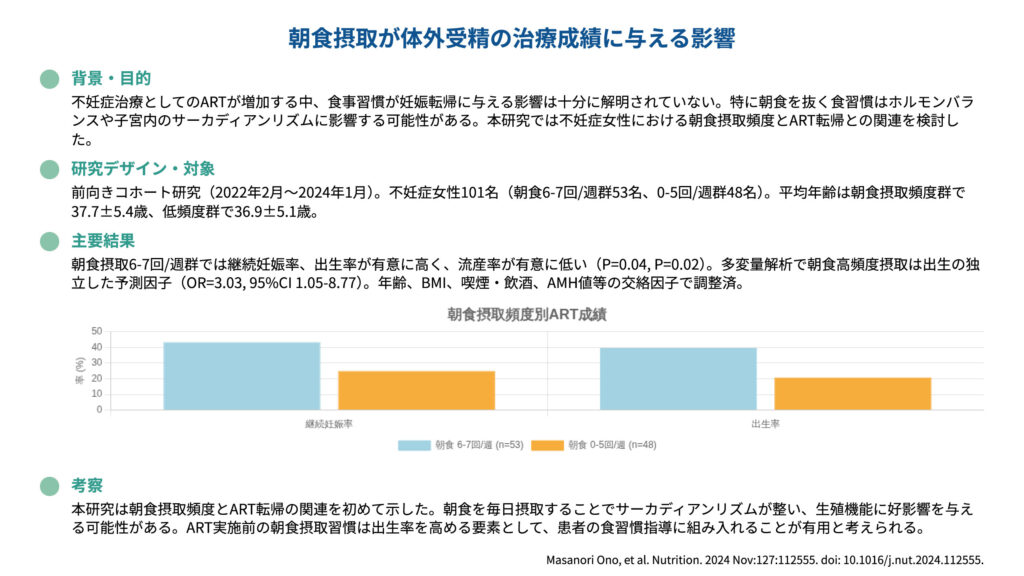 週6-7回の朝食摂取習慣がある患者さんでは、体外受精による出生率が高く、流産率が低いことが示されました。