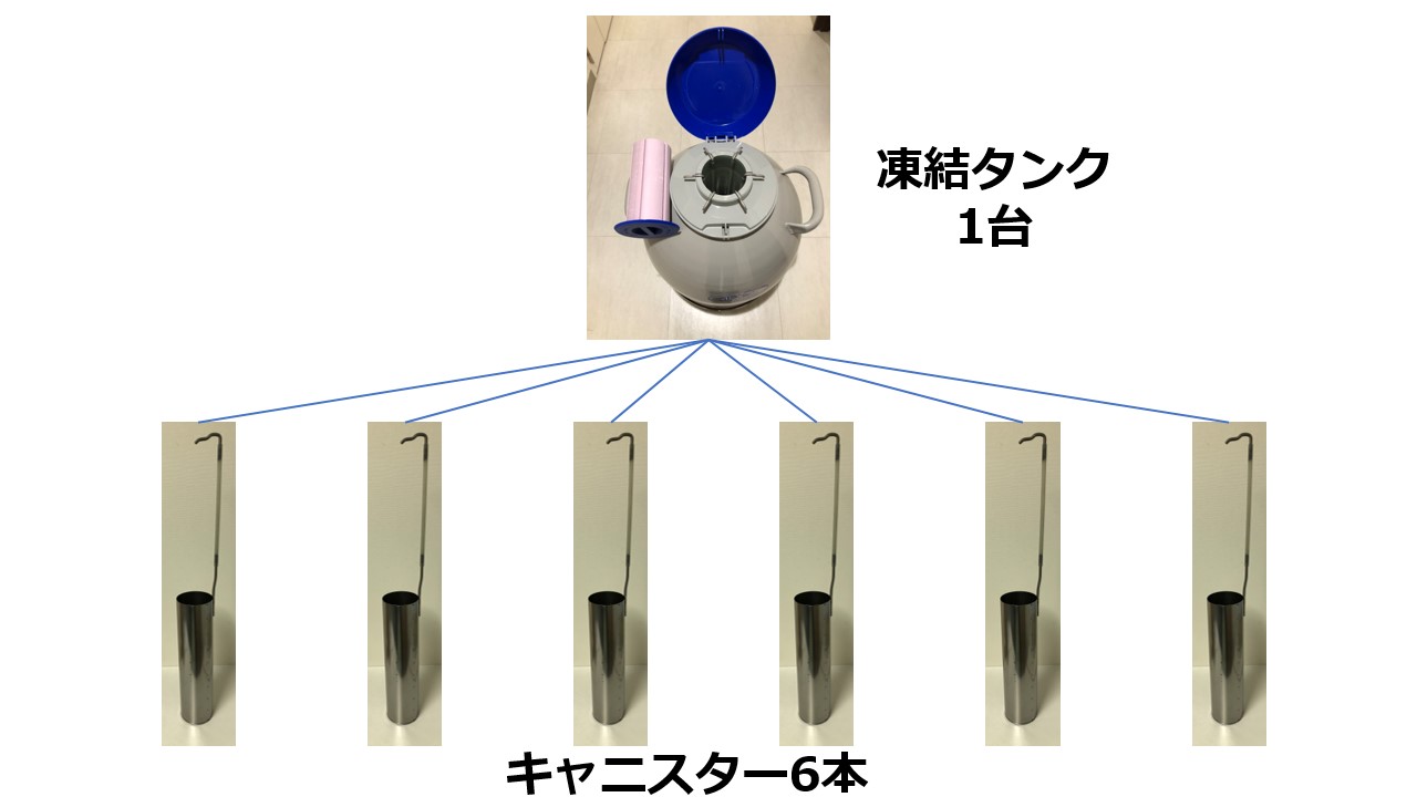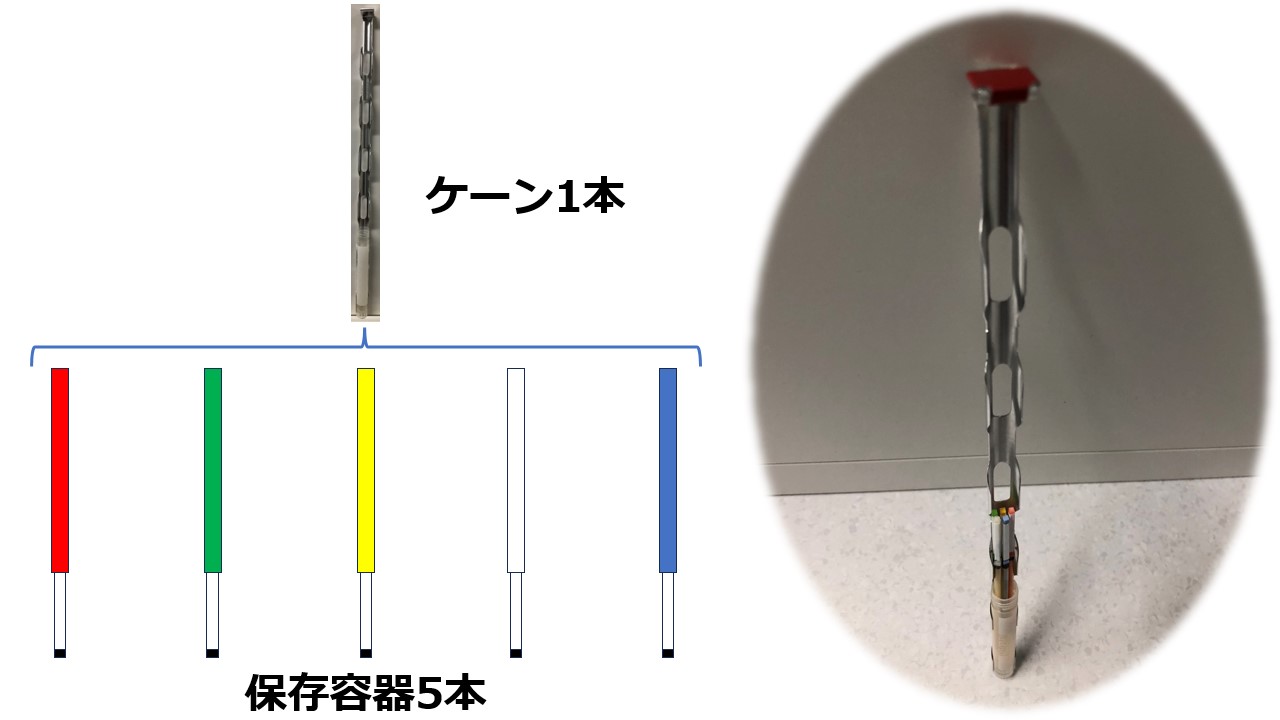 ケーンの中には最大5本の保存容器を収納できますが、仮にAさんの保存容器1個、Bさんの保存容器4個を同じケーンの中に一緒に5本まとめて保管することは、保存容器の取違えを防ぐ観点からしていません。したがって上記の例でいきますと、Aさんの保存容器1個のためのケーンを1本、Bさんの保存容器4個のための別のケーンを1本、合計2本のケーンを使うことにしています。