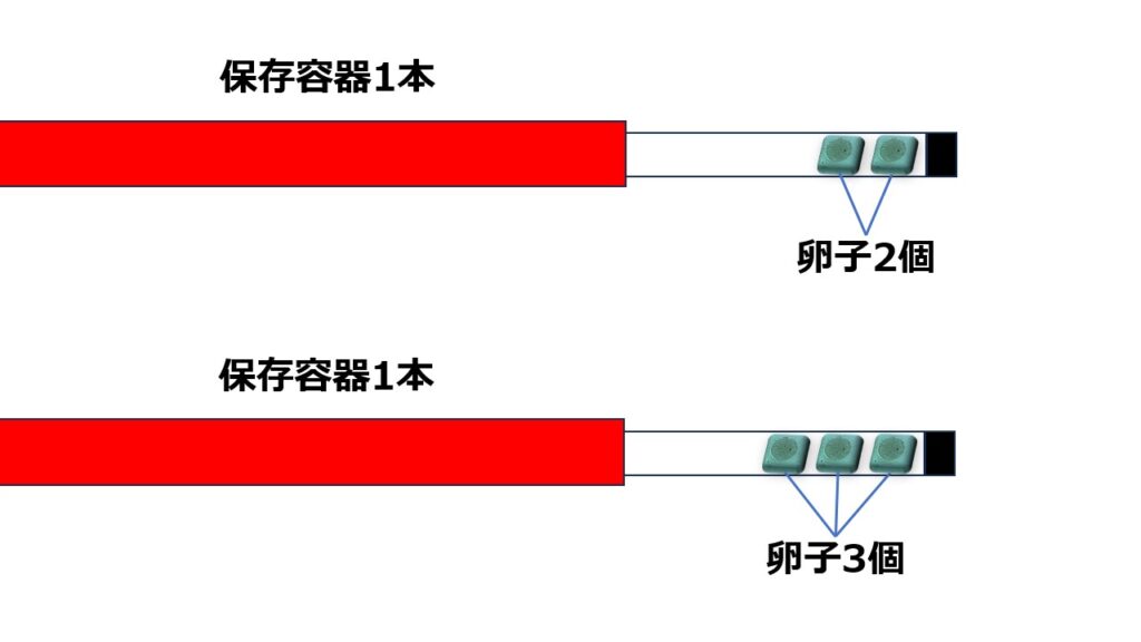 一つ目は1ケーン当たりに保管できる卵子の数を多くしたいからです。一般的に、1ケーンに保管できる保存容器は5本です。保存容器1本に卵子を1個保管したら1ケーン当たり最大5個までしか保管できません。仮に保存容器1本に卵子を2個保管したら1ケーン当たり最大10個保管できることになります。場合によっては保存容器1本に卵子を3個保管します。この場合1ケーン当たり最大15個保管できる計算になります。1保存容器に2-3個保管することは技術的に全く問題ありません。