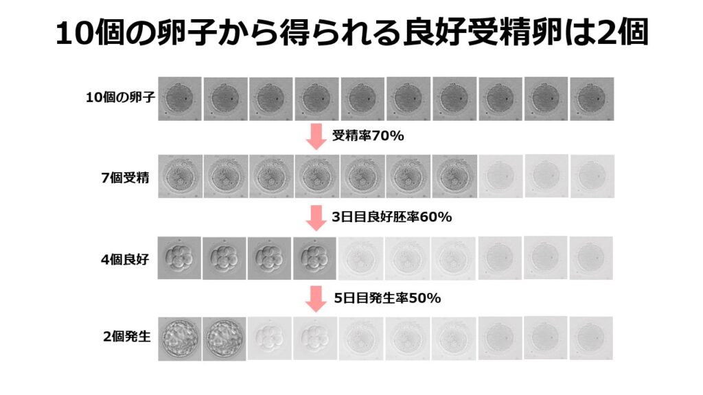 二つ目は1保存容器に卵子を1個だけ保管するメリットがあまり無いからです。受精胚まで育ててから凍結保存するのと卵子で凍結保存するのでは状況が全く異なります。卵子が受精胚になるまでには少なくとも、凍結融解後の生存、受精、順調な発育の3つの過程を経なければなりません。おおざっぱに計算すると10個の卵子から妊娠する可能性の高い受精胚まで育つのは2個しかありません。