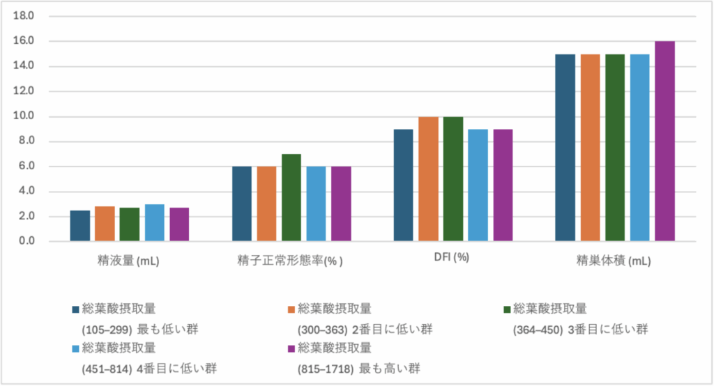 まとめとして、妊娠中期における母親の総葉酸摂取量の低下は、精子数低下および精巣体積の低下と関連していましたが、成人男性における非前進運動精子および不動精子の割合の低下とも関連していました。このことが実際の妊娠に影響するかどうかは、さらなる調査が必要です。妊娠中期における総葉酸摂取量の少ない母親の息子において、非前進精子あるいは不動精子の割合が低くなっていますが、論文の考察では想定外の結果であり、偶然の所見かもしれないとしていました。