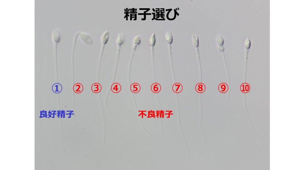 この操作を精子の頭の形が良く、動きの良い精子に出会うまでひたすら繰り返します。精子の頭の形が良い精子の割合が高ければ、数分で良い精子に巡り合いますが、精子の頭の形の良い精子の割合が低ければ、時には一個の精子の見つけるのに10分以上掛かります。