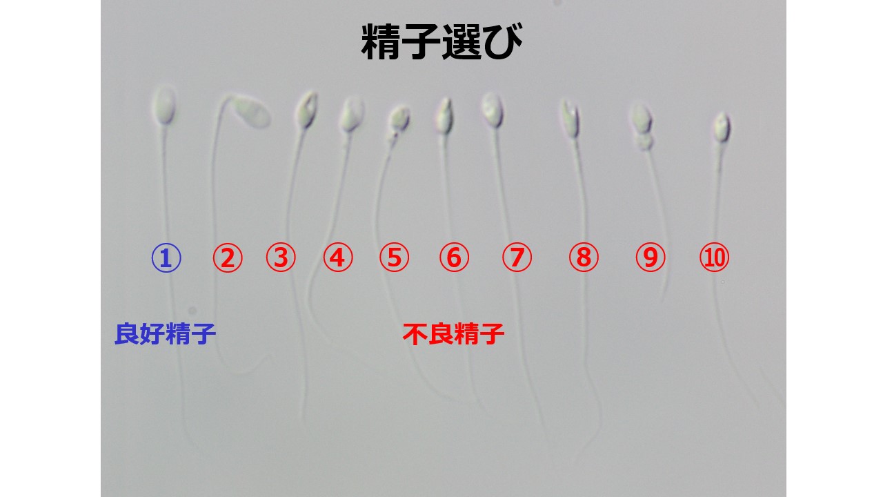 顕微授精で精子を見た時の頭の形と動きの良い精子が良い精子と判断して見つけます。大まかな指標として、以下に頭の形が良い良好精子(写真①)と頭の形が悪い不良精子(写真②-⑩)の写真を示します。