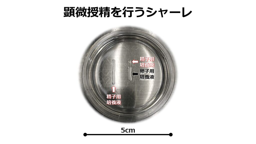 精子を見つける、見つけた精子を卵子の中に入れる操作はガラス製のシャーレの上で行います。シャーレの上にそれぞれ精子用と卵子用の培養液の滴を作ります。精子を探すのは左側の細長い精子用培養液になります。見つけた精子を卵子の中に入れるのは中央の細長い卵子用培養液になります。精子用培養液はポリビニルピロリドン(略称:PVP)と呼ばれる高分子化合物が含まれています。ここではPVPは培養液中の粘性を高めるために用いられます。通常の培養液内では精子は速く直進していることから、精子頭部の形をじっくりと観察することは困難です。そこで、粘性の高い培養液の中で精子を泳がせることで動きを遅くして精子頭部の形、精子の動き等をじっくりと観察します。