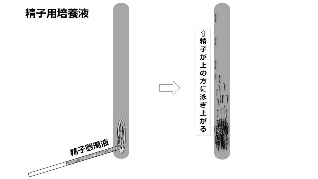 精子用培養液の下の方に精子の懸濁液を注入します。しばらくすると、精子は精子用培養液の上の方に泳ぎ上がるので、できるだけ精子用培養液の上の方から精子を探していきます。