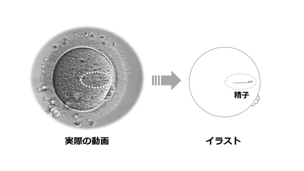動画は全部で17秒です。卵子を時計に見立てて3時方向、卵子の中、イラストに示す様に精子が見えます。