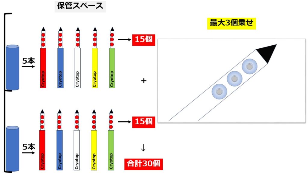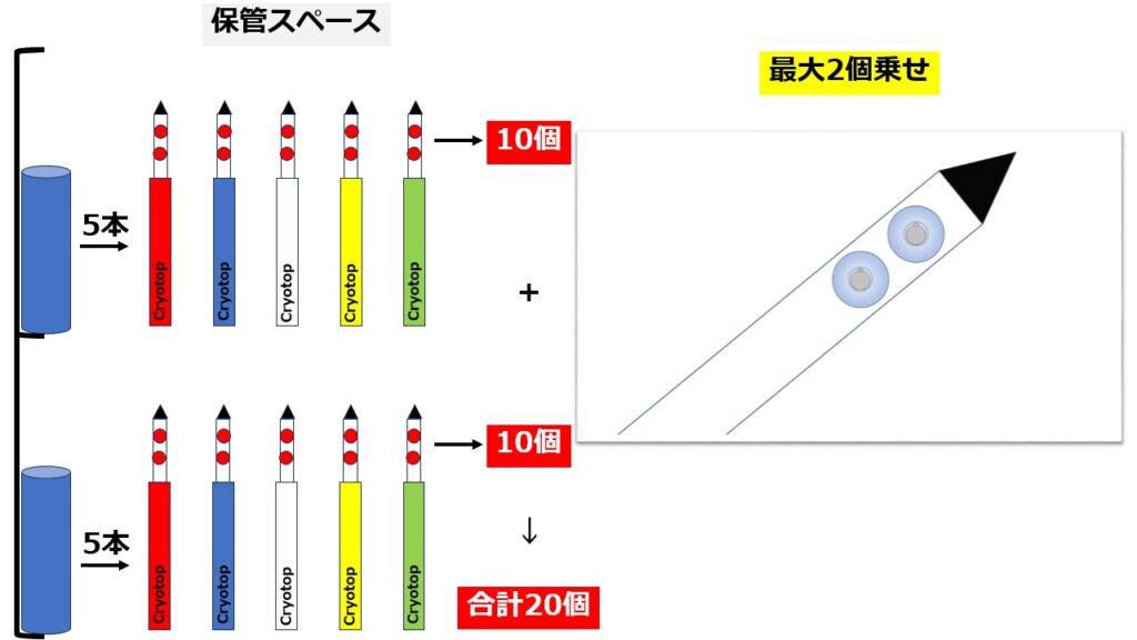 理論上、一つの保管スペースに最大何個の卵子を収納できるか説明します。1つの保存容器に卵子を「最大」何個乗せるかによって最大収納数は変わります。