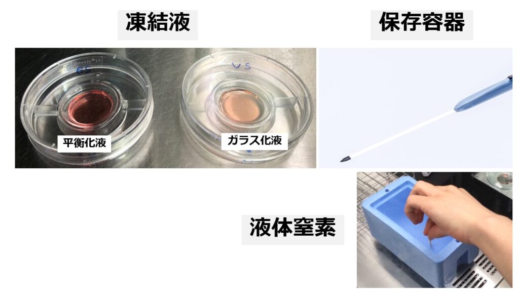 卵子凍結に必要な主な機材は、凍結液(二種類:平衡化液とガラス化液)、保存容器、液体窒素の3つになります。