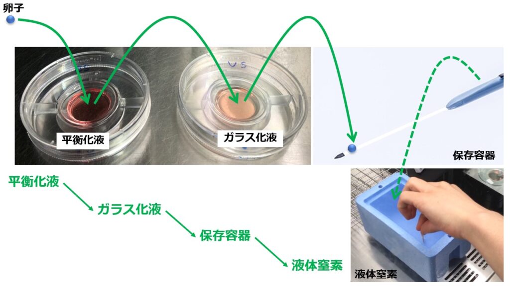 卵子凍結の流れは以下の通りです。卵子を順に平衡化液→ガラス化液に入れた後、保存容器の上に乗せて、保存容器ごと液体窒素の中に投入します。