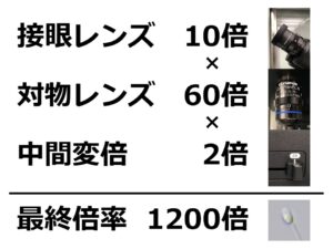 当クリニックでの精子選びは1,200倍で行っています。1,200倍の内訳ですが、接眼レンズの10倍と対物レンズの60倍を掛け合わせて600倍になったものを変倍装置で2倍にして最終的に1,200倍となっています。