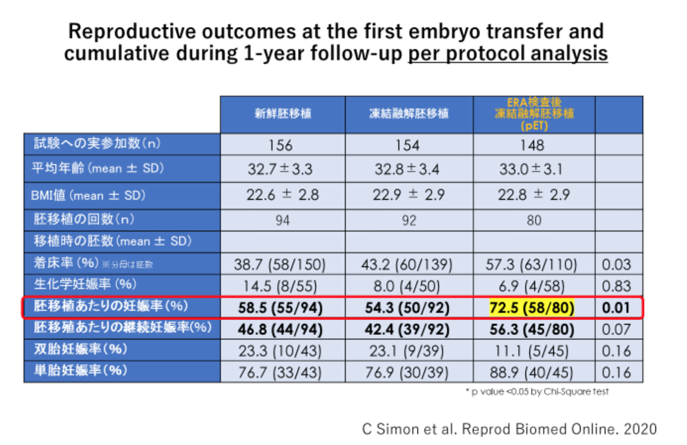 この臨床研究は前向き研究のため、これくらいの結果が出るだろうと想定して症例数を決めて開始します。当初30%程度の患者が割り付けから脱落するだろうとして症例数を決めたのですが、実際は50%の患者が脱落しました。しかし、プロトコール分析では、凍結融解胚移植・新鮮胚移植群と比較してpETの妊娠率、着床率、累積出生率が統計学的に有意に改善したことが示されました。胚移植前にERA検査を用いたpETの有用性が示唆されています。