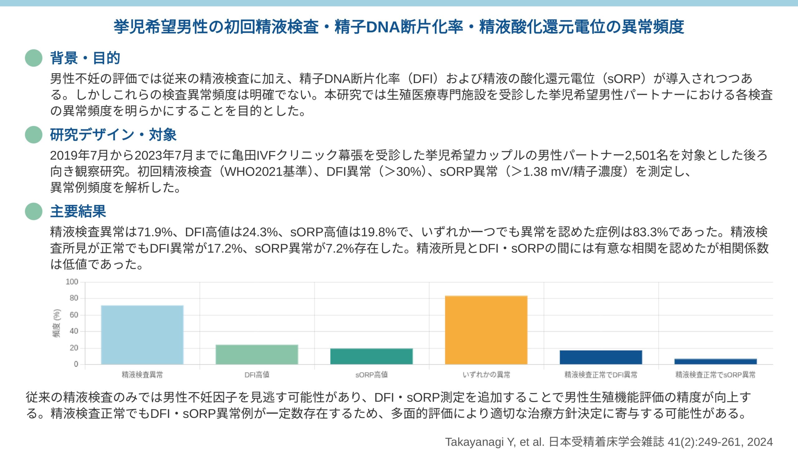 男性側の生殖機能の評価には従来の精液検査に加え、精子DNA断片化率(DFI)や精液の酸化還元電位測定(sORP)も導入されつつあります。挙児希望男性における精液検査やDFI、sORP検査の異常頻度は明確にした当院からの報告です。