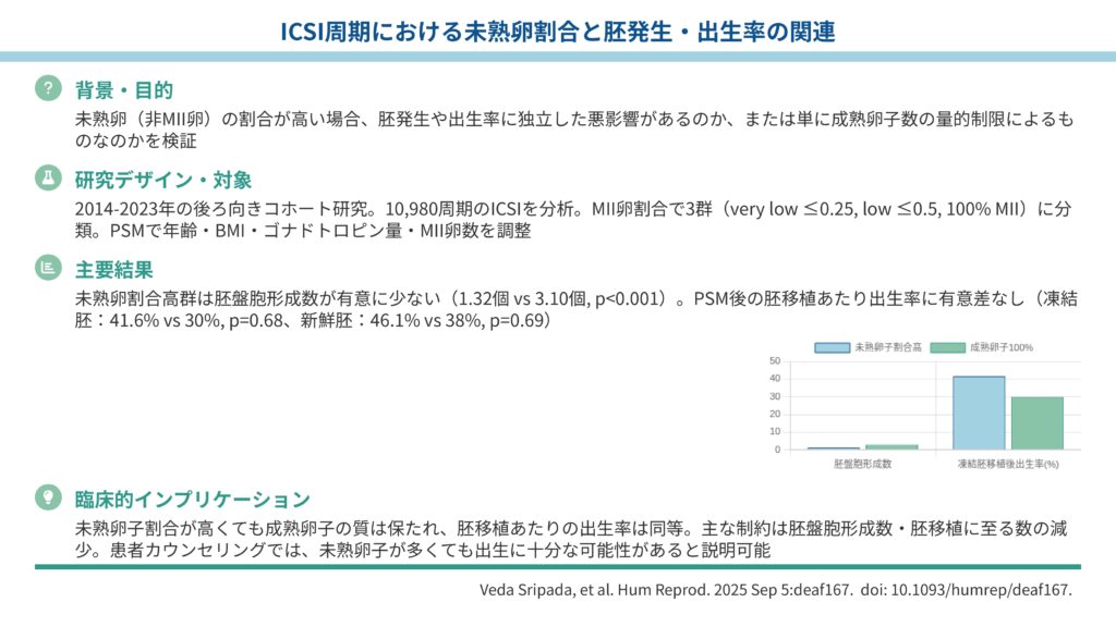 ICSI周期における未熟卵割合と胚発生・出生率の関連(Hum Reprod. 2025)