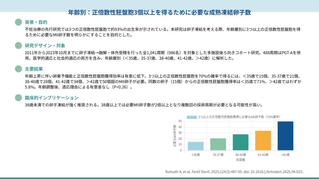 本研究は卵子凍結における年齢の重要性を定量的に示した重要な報告です。Cascante SD, et al. Fertil Steril. 2022の15年間605周期解析では38歳未満かつ20個以上の成熟卵子で50%以上の出生率を報告しています。