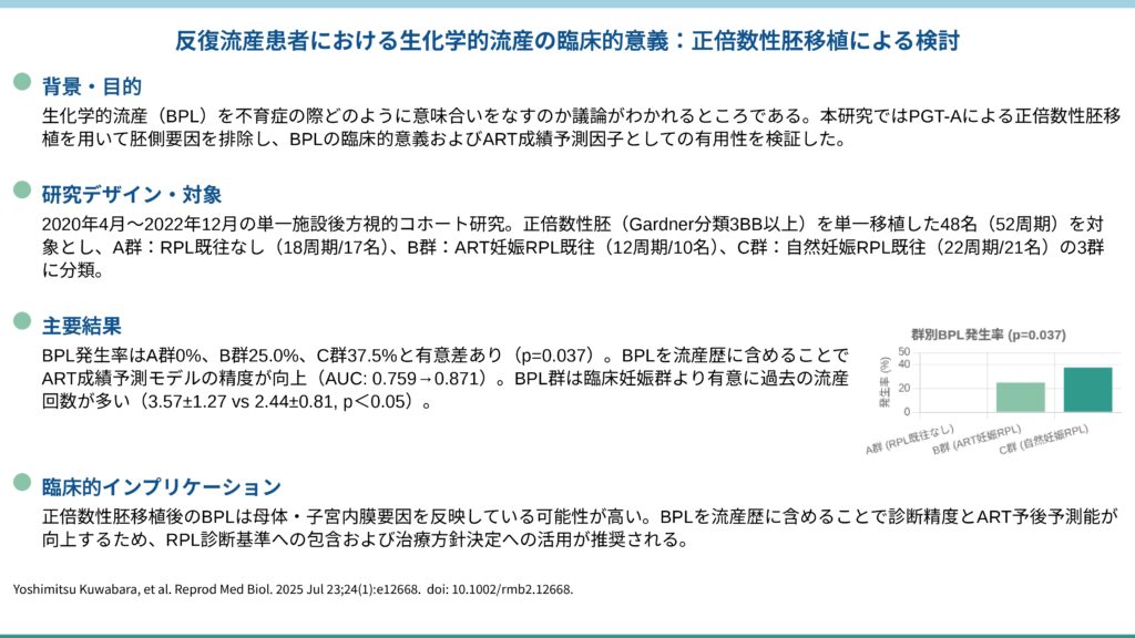 正倍数性胚移植後の生化学流産は胚要因よりも母体・子宮内膜要因を反映し、BPLを反復流産の診断基準に含めることで臨床評価と個別化医療の向上が期待されます。