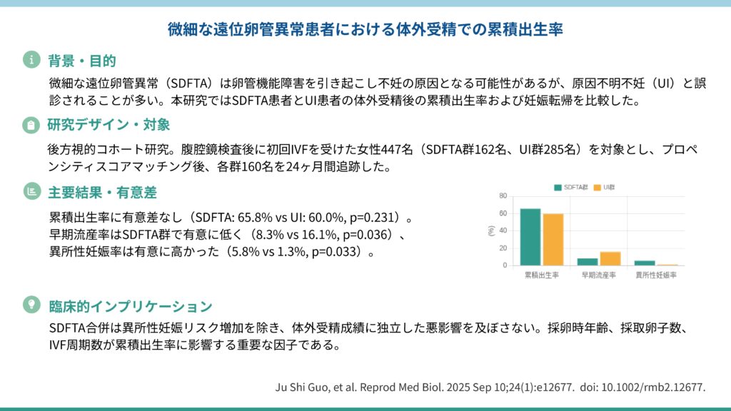 微細卵管遠位端異常(SDFTA)は、卵管遠位端に位置する目立たない解剖学的変化を特徴とする疾患群です。これには卵管峡部狭窄、卵管嚢状拡張、卵管采癒着などが含まれます。構造的には軽微でありながら、これらの異常は卵管機能を著しく損ない、不妊症の原因となる可能性があります。近年の疫学研究では、不妊女性におけるSDFTAの有病率は28.7%に達すると報告されており、その臨床的重要性が注目されています。SDFTAと原因不明不妊患者の体外受精における生殖予後を比較した報告をご紹介いたします。