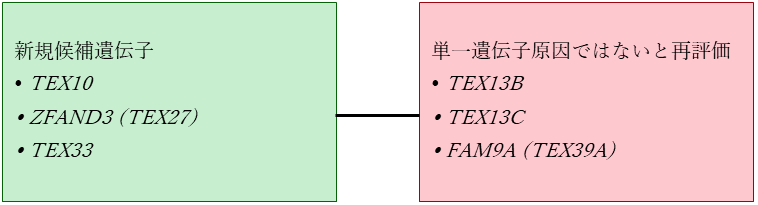 本研究結果から、常染色体顕性(優性)遺伝が予測されるTEX10およびZFAND3(TEX27)、ならびに常染色体潜性(劣性)遺伝が予測されるTEX33が、いずれも生殖細胞の成熟に必須と考えられる新規候補遺伝子として同定されました。また、TEX13B、TEX13C、FAM9A(TEX39A)のX連鎖遺伝子におけるヘミ接合性機能喪失(LoF)バリアントは、対照群男性にも認められたことから、男性不妊の単一遺伝子性の原因である可能性は低いと判断されました。