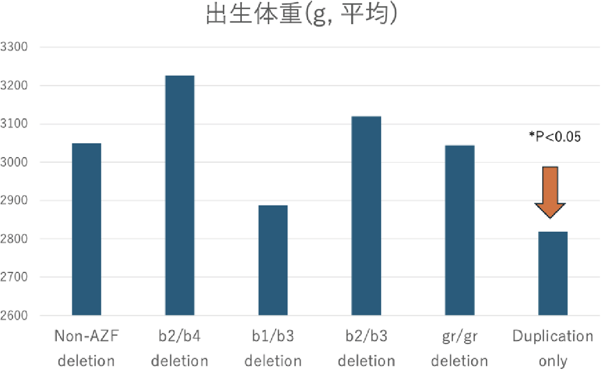 AZFc 一次重複は、精液所見が無精子症〜正常精子症まで幅広く、ICSI 後の出生児における低出生体重リスクの上昇という重要な所見が認められました。これは胎児発育や胎盤機能に影響を及ぼす可能性を示しています。