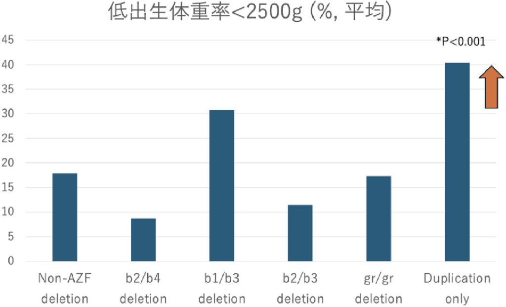一方、AZFc 一次重複(primary duplication)は精液所見が多様で、ICSI の妊娠成績・出生成績を悪化させ、特に低出生体重と関連します。