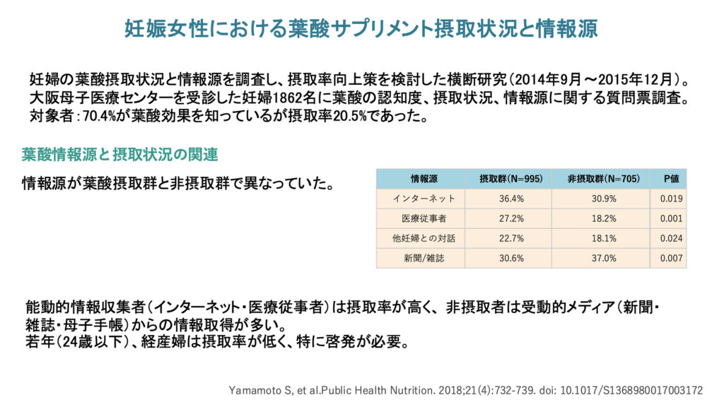 情報源の違いは興味深い知見で、摂取群は能動的にインターネットや医療従事者から情報を得ている一方、非摂取群は受動的なメディア(新聞・雑誌・母子手帳)に依存する傾向がありました。カナダやオーストラリアの報告でも医療従事者からの情報提供が重要であることが示されており(French MR, et al. J Am Diet Assoc. 2003; Chan AC, et al. Med J Aust. 2008)、日本でも産科医療従事者による積極的な情報提供の重要性が示唆されます。また、母子手帳による情報提供は妊娠届出後となるため、葉酸が必要な時期は過ぎてしまっています。若年女性や経産婦での摂取率が低いことから、これらの集団に対する啓発が必要です。不妊クリニックは、その窓口であることは確かです。しっかり関わっていきたいと思います。