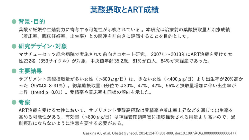 オランダでの研究(Boxmeer JC, et al. Hum Reprod, 2009)では、卵胞液中葉酸濃度の2倍増加が妊娠確率の3倍増加と関連していたという今回同様ポジティブな報告もありますが、英国での研究(Haggarty P, et al. Lancet, 2006)では妊娠前葉酸と妊娠成功の関連は認められないという報告もあります。