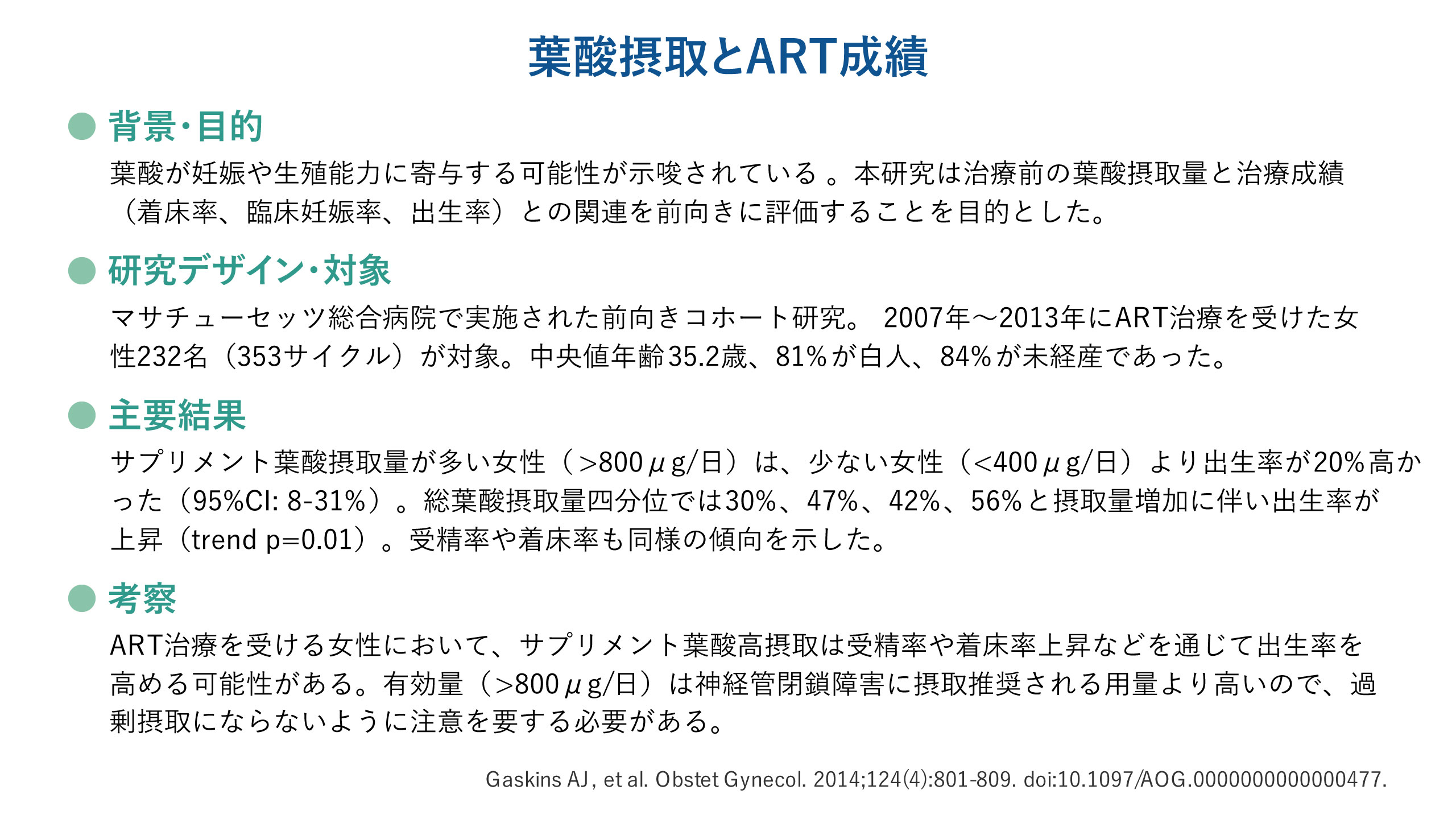 葉酸サプリメント摂取量が800μg/日以上の女性では、ART治療後の出生率が20%高くなりました。