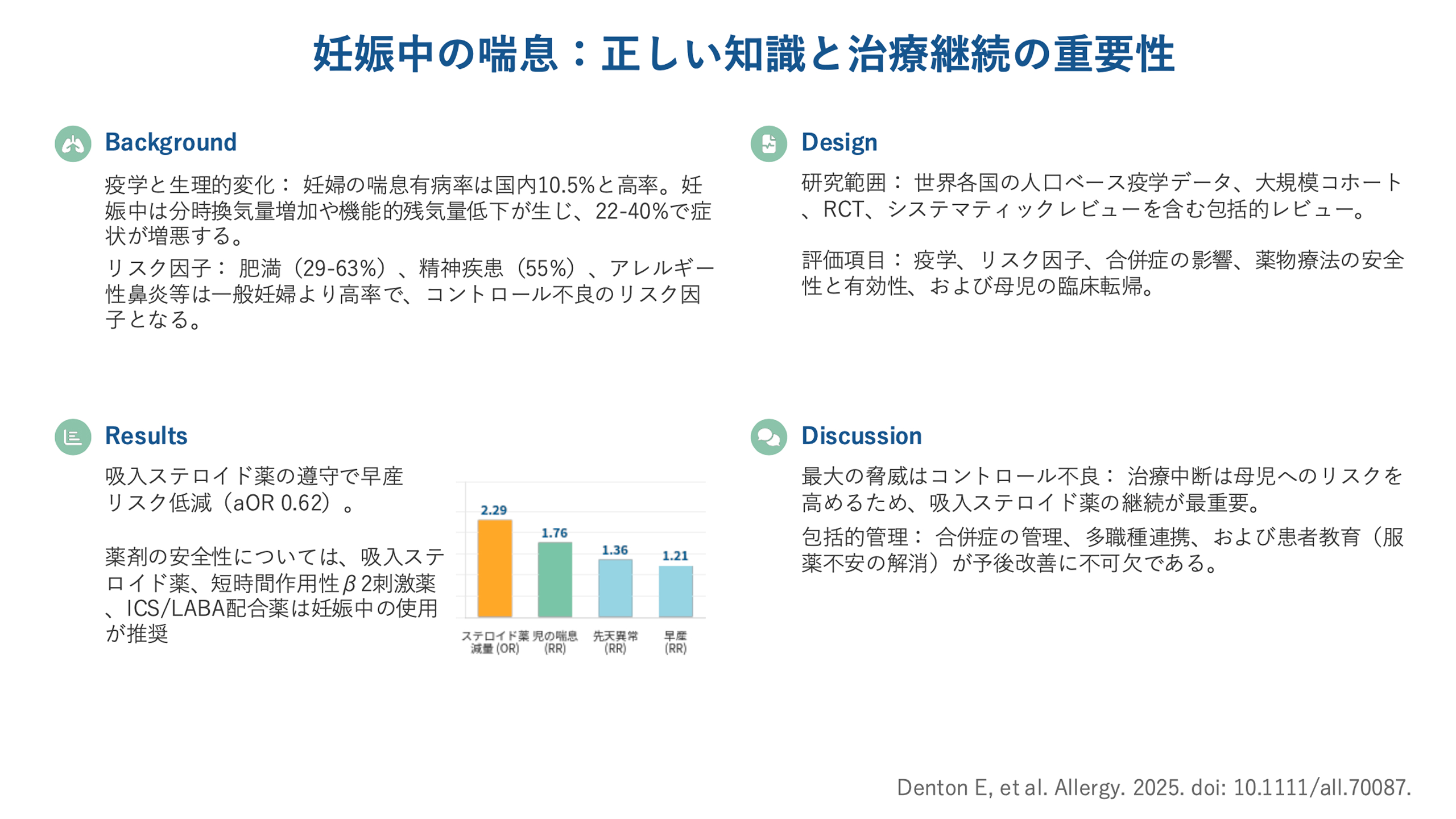 どんな場合でも共通することですが、重要なのは、「完全に安全な薬」を求めるのではなく、「治療しないリスク vs 治療するリスク」を正しく理解すること。有益性を適宜判断することです。妊娠中の喘息管理は、産婦人科医と呼吸器内科医の連携のもと、個々の患者さんの状況に応じた個別化対応が好ましいですね。