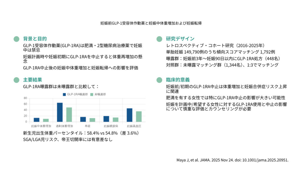 妊娠前GLP-1RA使用歴のある女性は、妊娠中体重増加が多く、早産、妊娠糖尿病、妊娠高血圧症候群のリスクが高くなる可能性があります。