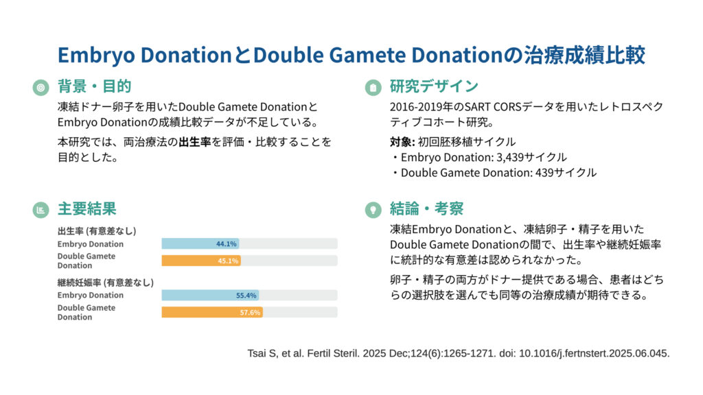 日本ではあまり馴染みがありませんが、欧米では卵子と精子の両方を提供で得る必要がある場合、大きく2つの選択肢があります。1つ目は「提供胚(embryo donation)」で、他のカップルの体外受精治療で余った凍結胚を譲り受ける方法です。2つ目は「二重配偶子提供(double gamete donation)」で、卵子提供者と精子提供者を自ら選択し、新たに胚を作成する方法です。前者は費用が安く入手しやすい反面、胚の質や背景情報が不明確な場合があります。後者は提供者を選べる利点がありますが、費用が高額です。今回、米国の全国データを用いて、これら2つの方法の妊娠予後を比較した初めての大規模研究をご紹介いたします。