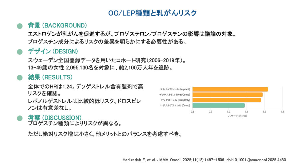 プロゲスチンの種類により乳がんリスクに実質的な差異があることを示した点、デソゲストレル含有製剤がレボノルゲストレル含有製剤よりも高いリスクと関連していたことが記載されています。