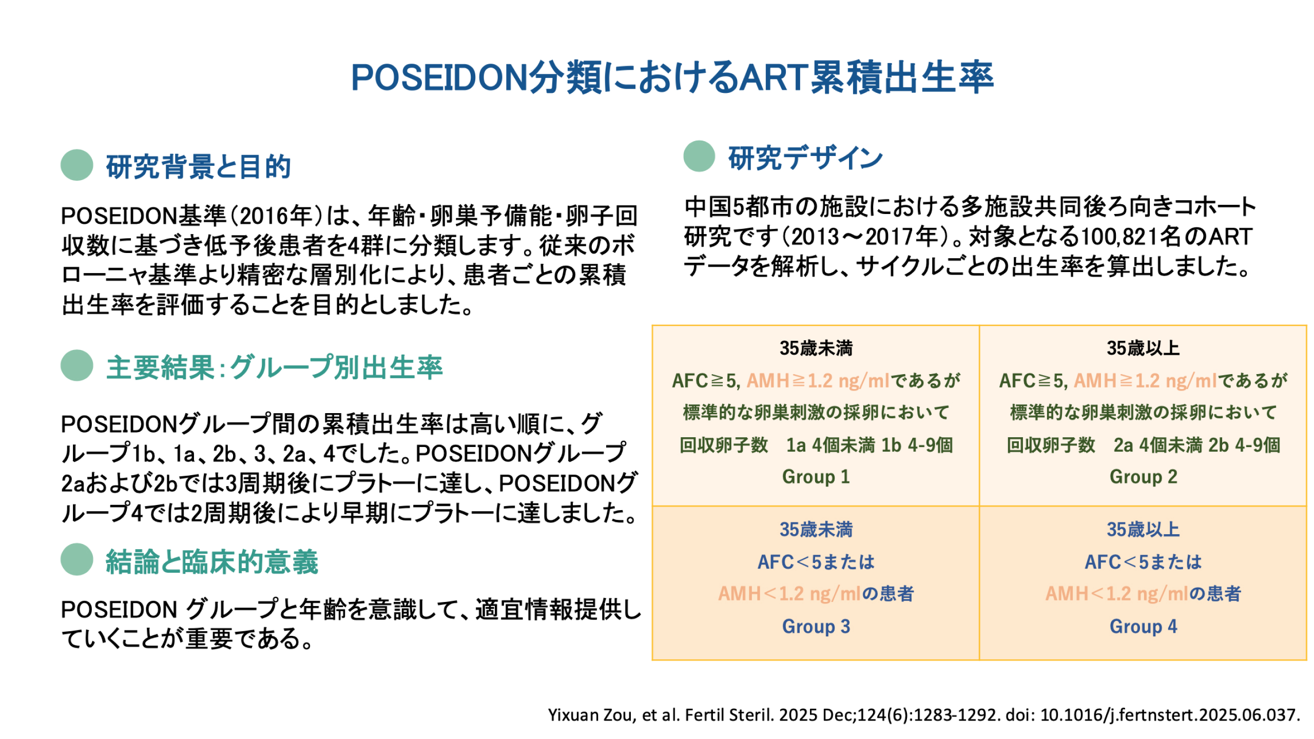 2016年にPOSEIDON(Patient-Oriented Strategies Encompassing Individualized Oocyte Number)基準が導入され、年齢、卵巣予備能、採卵数などを考慮したより詳細な低予後患者の層別化が可能になりました。しかし、POSEIDON分類における各グループの累積出生率や、複数周期の治療により累積出生率がいつプラトーに達するかについては、十分なエビデンスが不足していました。今回、中国5都市の生殖医療センターで実施された大規模多施設後方視的コホート研究をご紹介いたします。