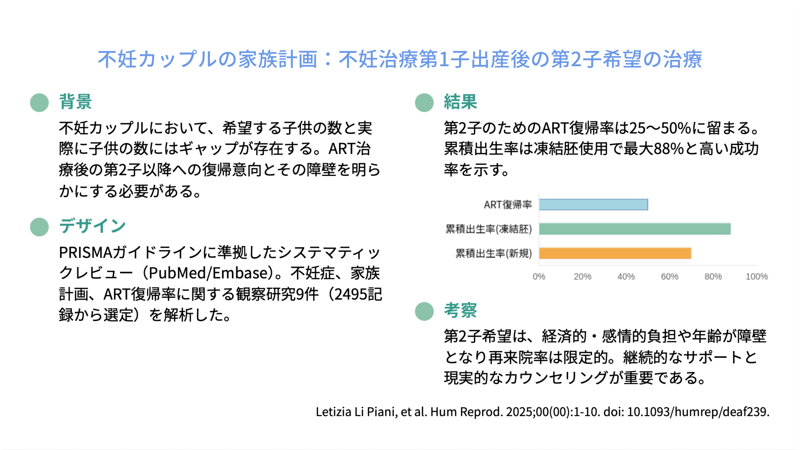 2495件のスクリーニングから9研究が採択されました。採択された研究の多くはART(IVF/ICSI)で第1子を出産したカップルが対象でしたが、一部には排卵誘発・人工授精での妊娠例や自己申告による不妊カップルも含まれていました。不妊カップルは一貫して、妊孕性のあるカップルと比較して家族規模が小さいことが報告されました。第2子のためのART再来院率は25~50%の範囲であり、これは凍結受精胚を保有している場合でも同様でした。再来院に関連する因子には、若年齢、凍結受精胚の保有、過去の治療特性が含まれました。しかし、感情的、経済的、社会的負担がさらなるART利用を妨げることが多く認められました。