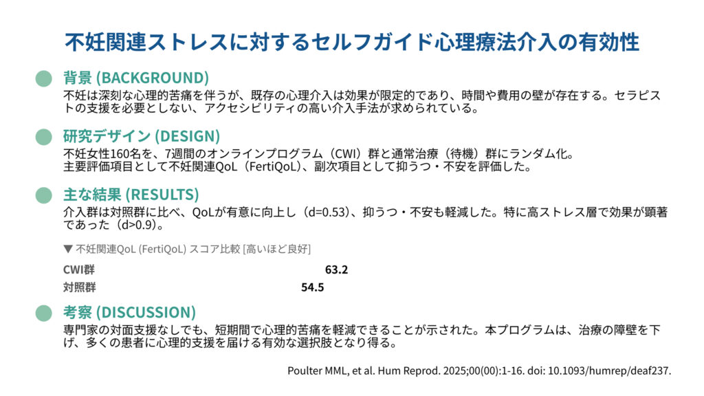 オンライン7週間セルフヘルププログラムCoping with Infertility(CWI)は、ベースラインでQOLが低い、または抑うつや不安症状が高い人々において、通常治療と比較して生活の質、苦痛、抑うつ、不安の改善に大きな効果を示しました。