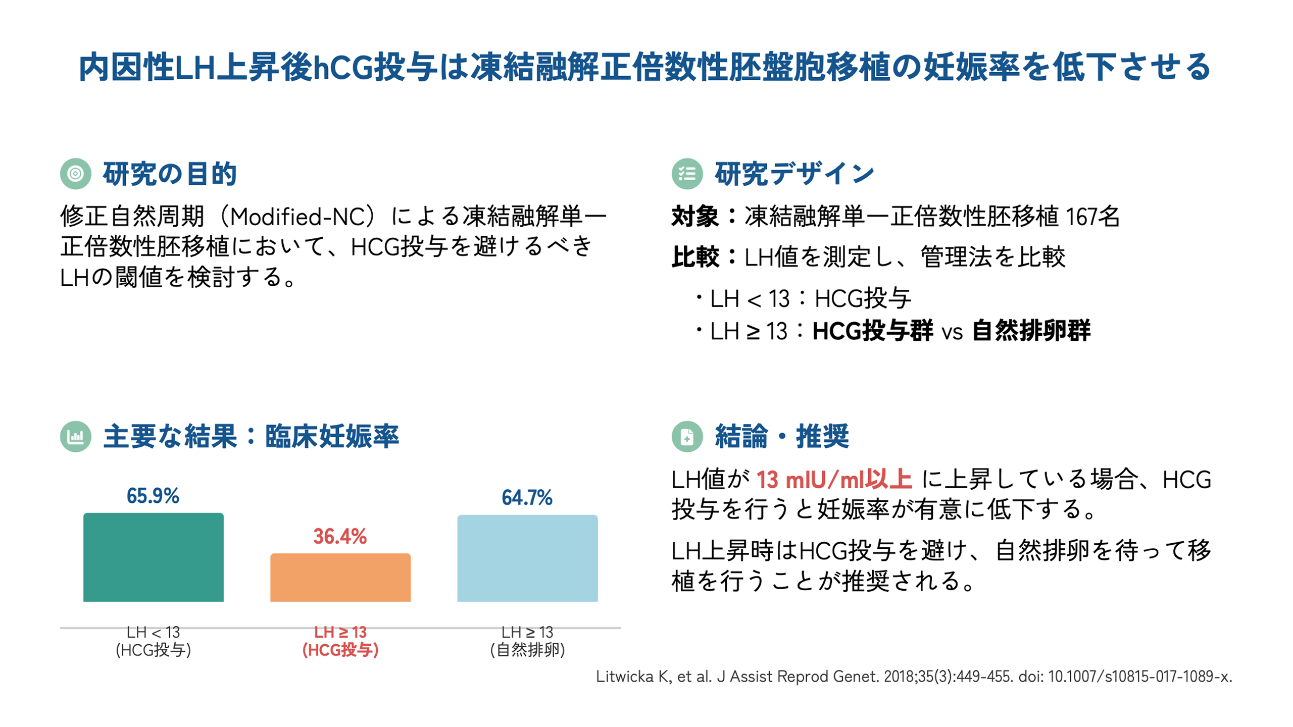 修正自然排卵周期における凍結融解正倍数性胚盤胞移植では、hCG投与日のLH値が13mIU/ml以上の場合、hCG投与を避けて自然排卵を待つことで妊娠率が改善される可能性があります。