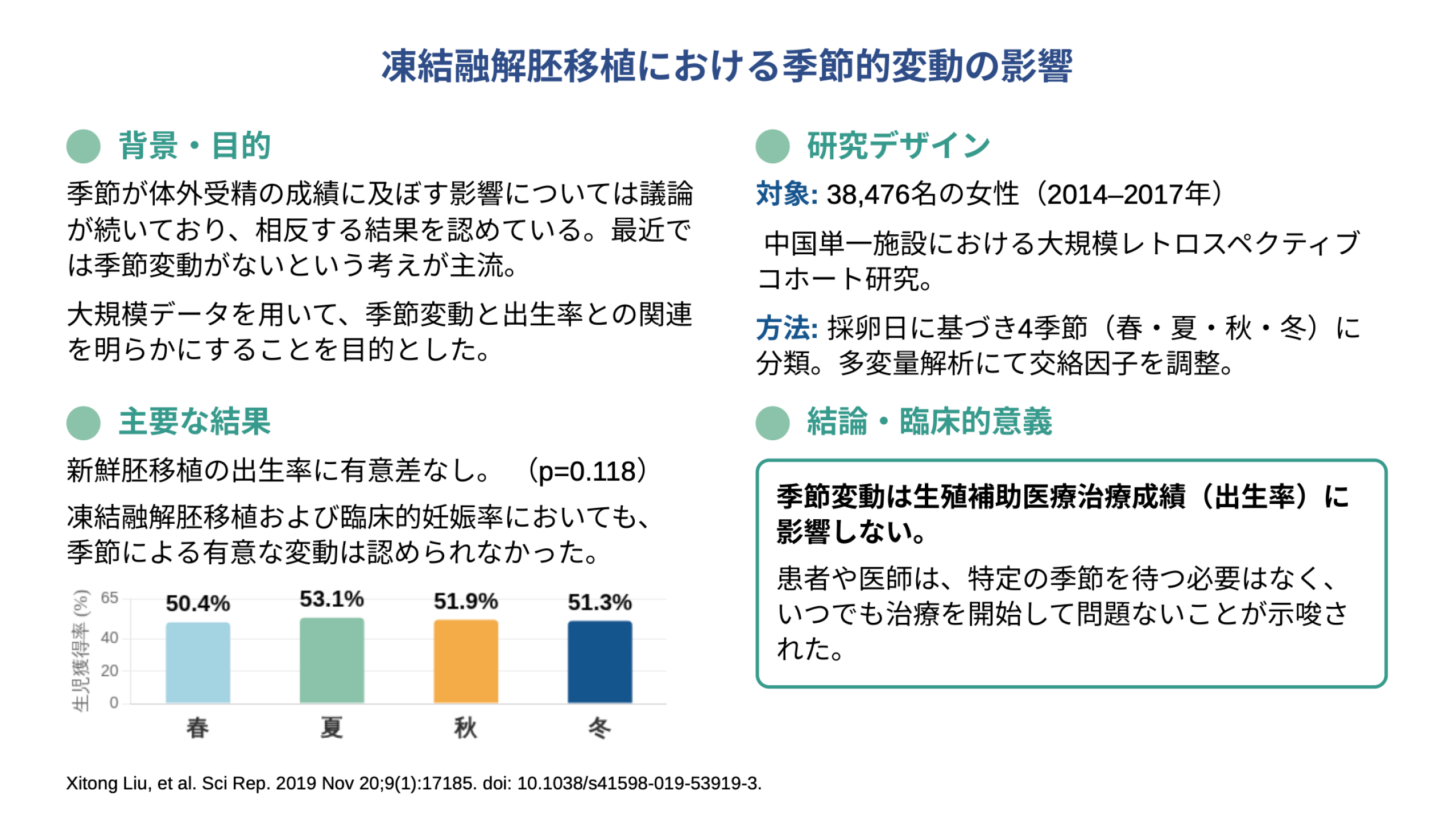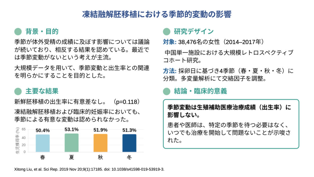 新鮮胚移植および凍結融解胚移植のいずれにおいても、季節的な変動は臨床妊娠率や出生率に有意な影響を及ぼさないことがわかりました。