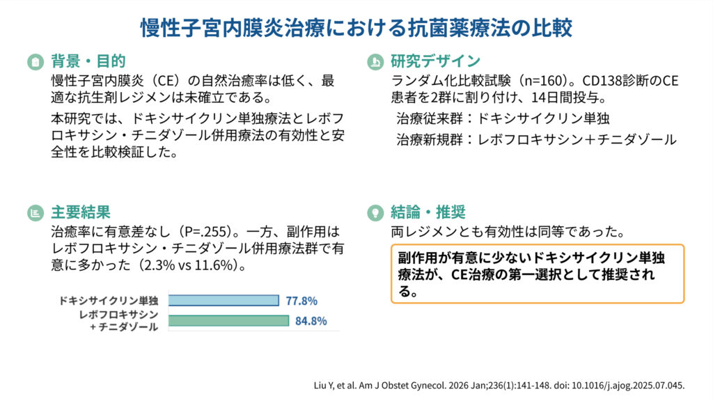 慢性子宮内膜炎は不妊症、反復流産、反復着床不全などの妊娠予後不良と関連し、治療により妊娠予後が改善することが知られています。主要な病原菌はStreptococci、Enterococcus faecalis、Escherichia coli、Staphylococci、Ureaplasma urealyticum、Chlamydiaとされています。自然治癒率は低く、従来の細菌培養だと検出が難しいことから広域スペクトル抗菌薬による経験的治療が主流となっています。現在、ドキシサイクリン単独療法とレボフロキサシン・チニダゾール併用療法が最も広く使用されていますが、どちらが優れているかのコンセンサスがありません。本研究では、これら2つの抗菌薬療法の有効性と安全性を直接比較したランダム化比較試験をご紹介いたします。