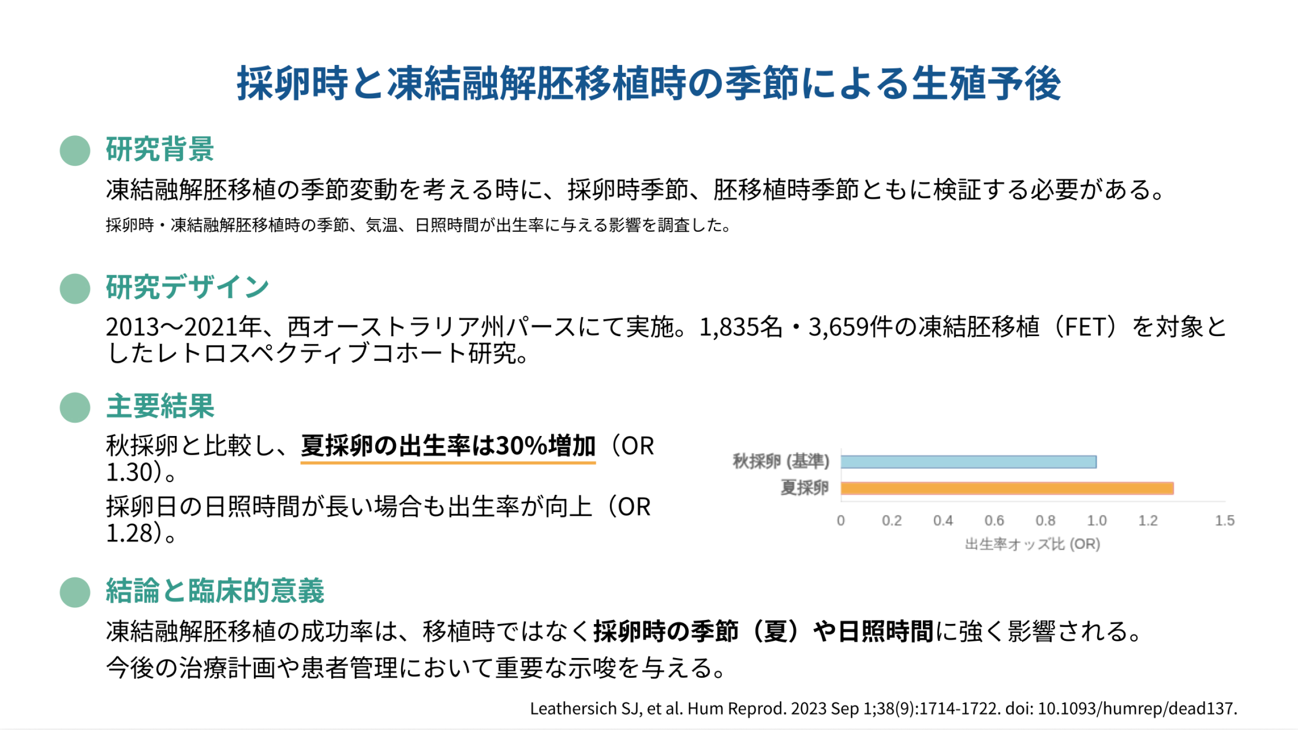 採卵が夏に行われた凍結融解胚移植では、秋に採卵された場合と比較して出生率が30%増加し、この効果は胚移植時の季節とは無関係でした。日照時間が長い日の採卵も出生率向上と関連していました。