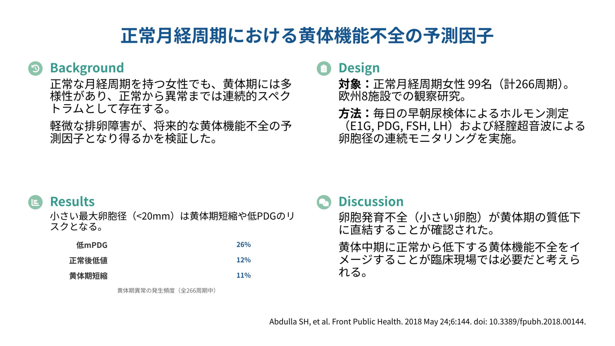 正常周期女性における排卵前期、排卵周辺期、黄体期の特徴間の潜在的関係を調査することを目的とした観察研究です。8施設から99名266周期が解析されました。組み入れ基準は年齢19-45歳、前回の月経周期24-34日で、無排卵周期、不妊症、PCOS、黄体機能不全などの異常周期の既往がないことでした。参加者は毎日早朝尿を採取し、エストロン-3-グルクロニド(E1G)、プレグナンジオール-3α-グルクロニド(PDG、プロゲステロンの尿中代謝産物)、FSH、LHを測定しました。また、頸管粘液出現またはLH surge検出から開始し、卵胞が16mmに達するまで1日おき、その後排卵確認まで毎日の連続的な経腟超音波検査を受け、超音波で決定された排卵日(US-DO)を確定しました。ホルモン測定は周期3日目±1日(卵胞期早期)、US-DO±1日(排卵周辺期)、US-DO+5日、US-DO+7日、US-DO+9日の平均値(黄体期中期PDG値:mPDG)で評価しました。評価項目として、短い黄体期(US-DO+1日から月経前日までが12日未満)、低いmPDG(10 µg/mg Cr未満)、正常から低下する黄体期PDG値(US-DO+5日とUS-DO+7日の平均が10 µg/mg Cr以上だがUS-DO+9日が10 µg/mg Cr未満、つまり黄体期後期の早期低下)、低値から正常化する黄体期PDG値(US-DO+5日が10 µg/mg Cr未満だがUS-DO+7日とUS-DO+9日の平均が10 µg/mg Cr以上、つまり遅延黄体化)の4つを解析しました。