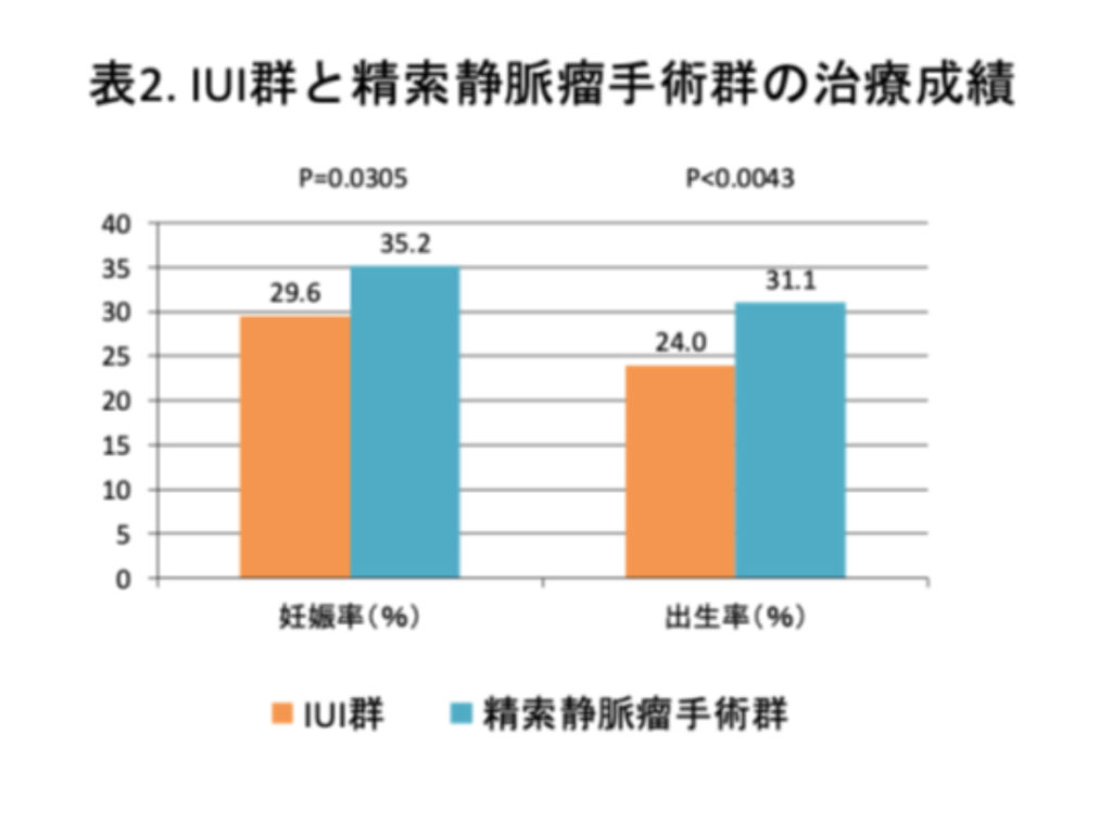 - 精索静脈瘤を有し軽度の精液所見異常を認める男性を対象に、顕微鏡下精索静脈瘤手術と人工授精(IUI)の治療成績を後ろ向きに比較しました。