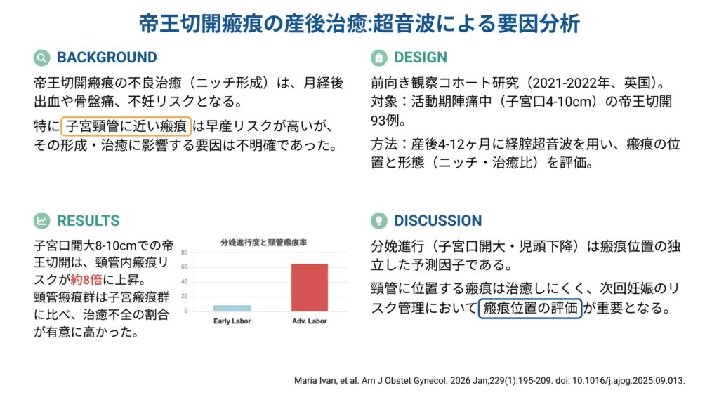 分娩進行期の子宮口開大度と児の先進部位置が帝王切開瘢痕の位置を独立して予測し、子宮頸部内または子宮頸部近傍の瘢痕は子宮体部の瘢痕よりも治癒不良となります。