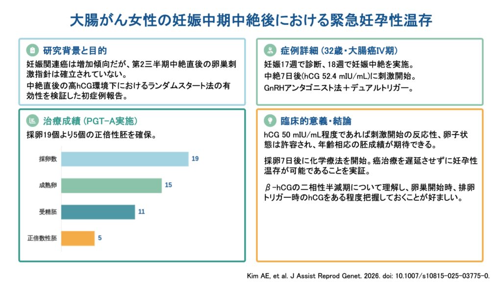 妊娠中期中絶後すぐにランダムスタートCOSと胚凍結保存による妊孕性温存を行った症例報告です。32歳の初産婦が妊娠17週に進行大腸がんと診断されました。緊急化学療法を開始するため、患者は妊娠18週で選択的中絶を受けました。中絶の7日後にGnRHアンタゴニスト法を用いたランダムスタートCOSが開始されました。β-hCG値は52.4 mIU/mLでしたが、卵巣刺激が開始されました。患者のBMIは21.7 kg/m²、5ヶ月前のAMH値は5.3 ng/mLでした。Gonal-F 150単位とMenopur 150単位が1日1回投与され、その後ステップダウン方式で調整されました。刺激11日目に主席卵胞の平均径が21 mmに達した時点で、GnRHアゴニスト4 mgが投与されました。トリガー当日のβ-hCG値は5.9 mIU/mLでした。しかし翌朝LH反応不良でhCG 3300単位を翌夜追加し、hCGトリガーから35時間後に採卵しました。結果