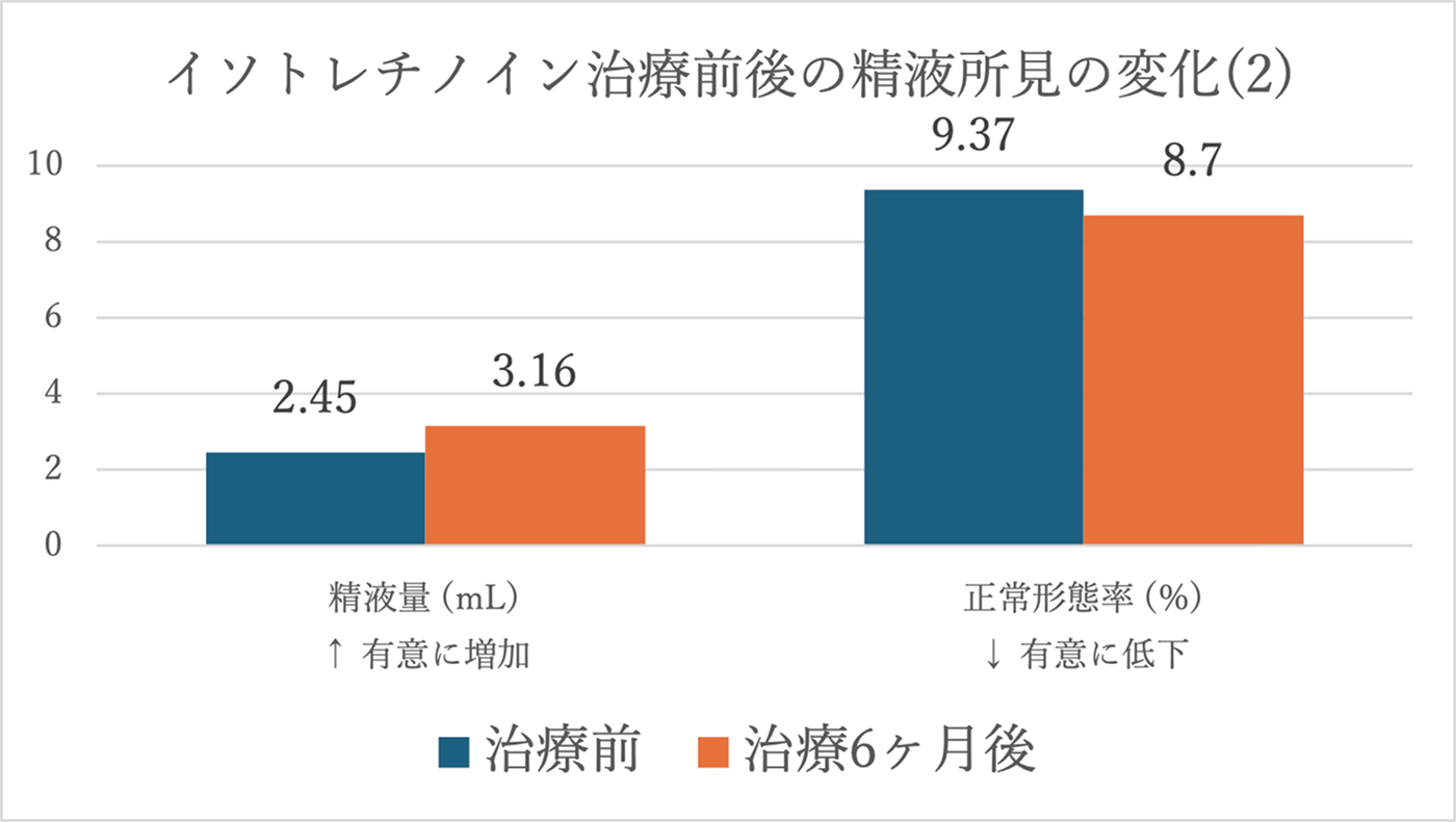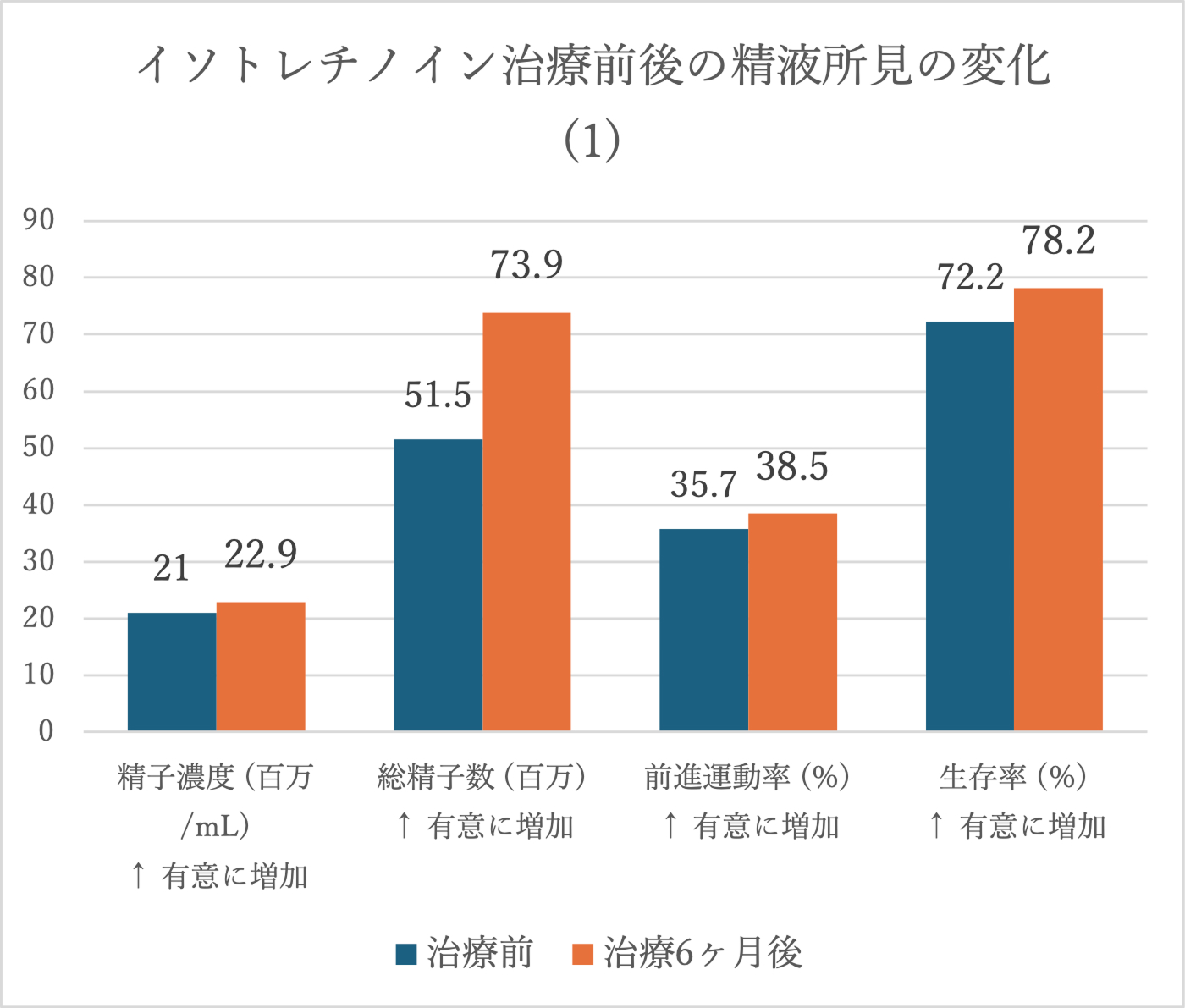 イソトレチノイン治療により、精液量や精子数、運動率などは有意に改善しました。