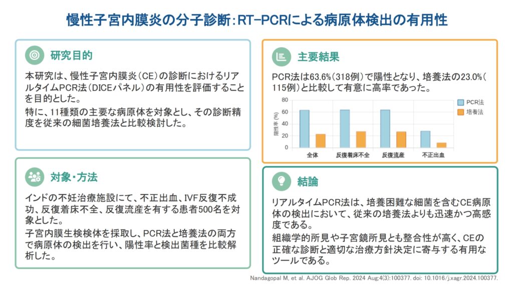 慢性子宮内膜炎(CE)は、細菌感染などによる子宮内膜粘膜の持続的な炎症を特徴とし、生殖年齢女性の潜在的な不妊原因となります。CEは従来の臨床症状に乏しく、診断が困難です。不妊症、反復着床不全(RIF)、不育症(RPL)の女性はCE発症リスクが高いとされています。従来の診断法である子宮鏡検査、組織学的検査、細菌培養法にはそれぞれ限界があり、特に培養困難な病原体の検出は課題でした。今回、インド人女性500例を対象に、RT-PCRによる11種の主要病原体の分子診断と従来の培養法を比較した後方視的研究をご紹介いたします。