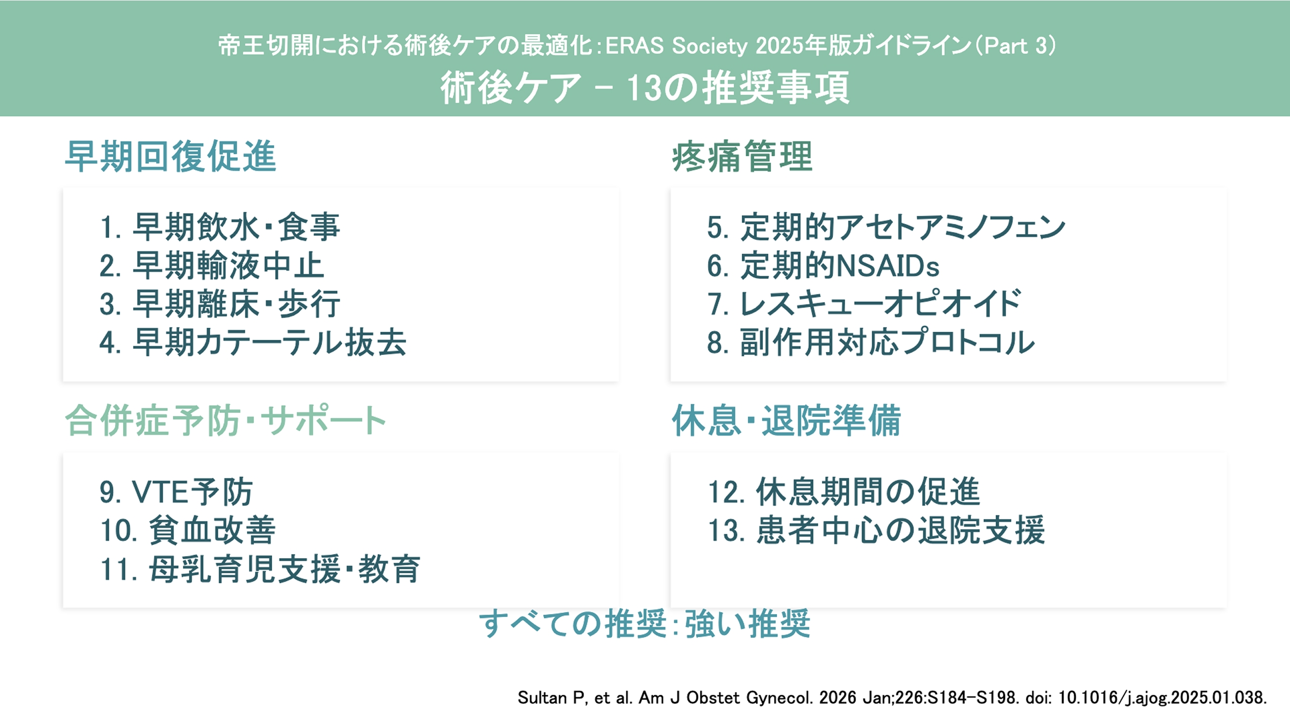 帝王切開後の術後ケアとして13の介入が推奨されました(すべて強い推奨)。
