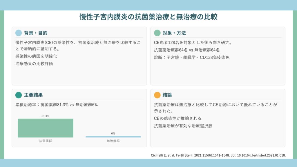 慢性子宮内膜炎に対する抗菌薬治療は、無治療と比較して累積治癒率が有意に高く(81.25% vs. 6.25%)、CEの感染性本態が示唆されました。