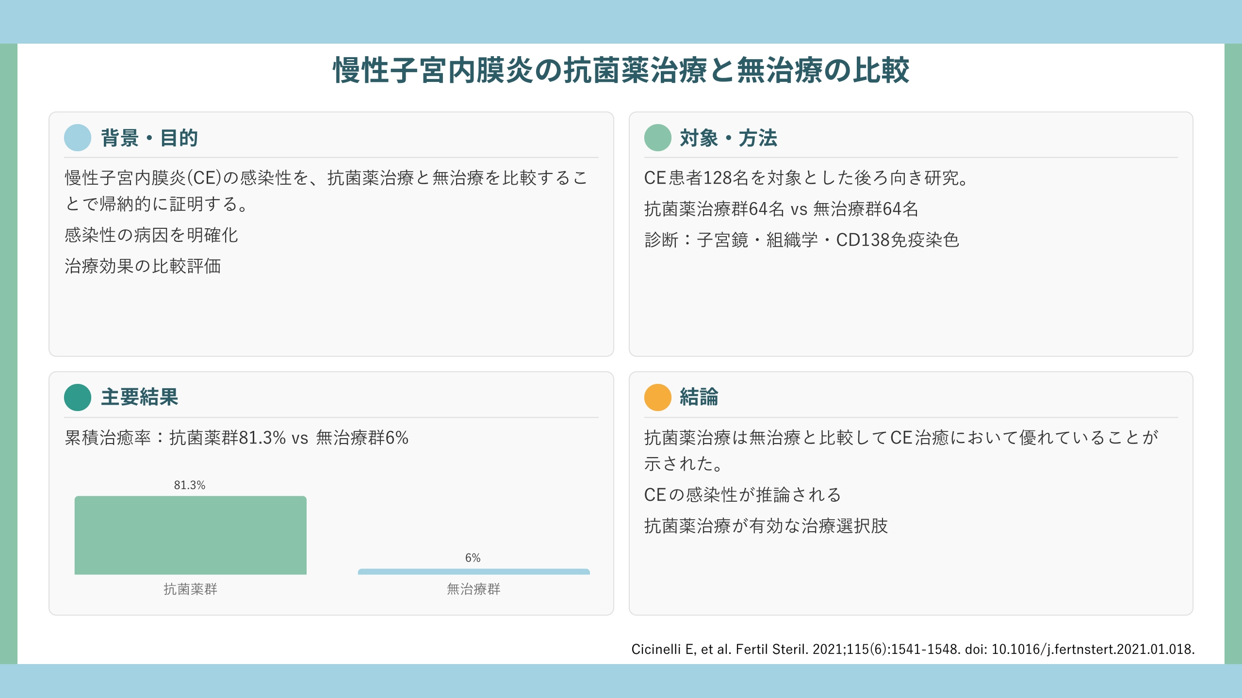 慢性子宮内膜炎(CE)は、子宮内膜の慢性炎症状態であり、大腸菌、連鎖球菌、ブドウ球菌、マイコプラズマ、ウレアプラズマなどの細菌過剰増殖との関連が報告されています。反復着床不全(RIF)女性での有病率は30-70%とされ、生殖予後に悪影響を及ぼす可能性が示唆されています。しかし、CEに対する抗菌薬治療の有効性を無治療群と直接比較した研究はこれまで存在しませんでした。今回、抗菌薬治療と無治療を比較した初の症例対照研究をご紹介いたします。