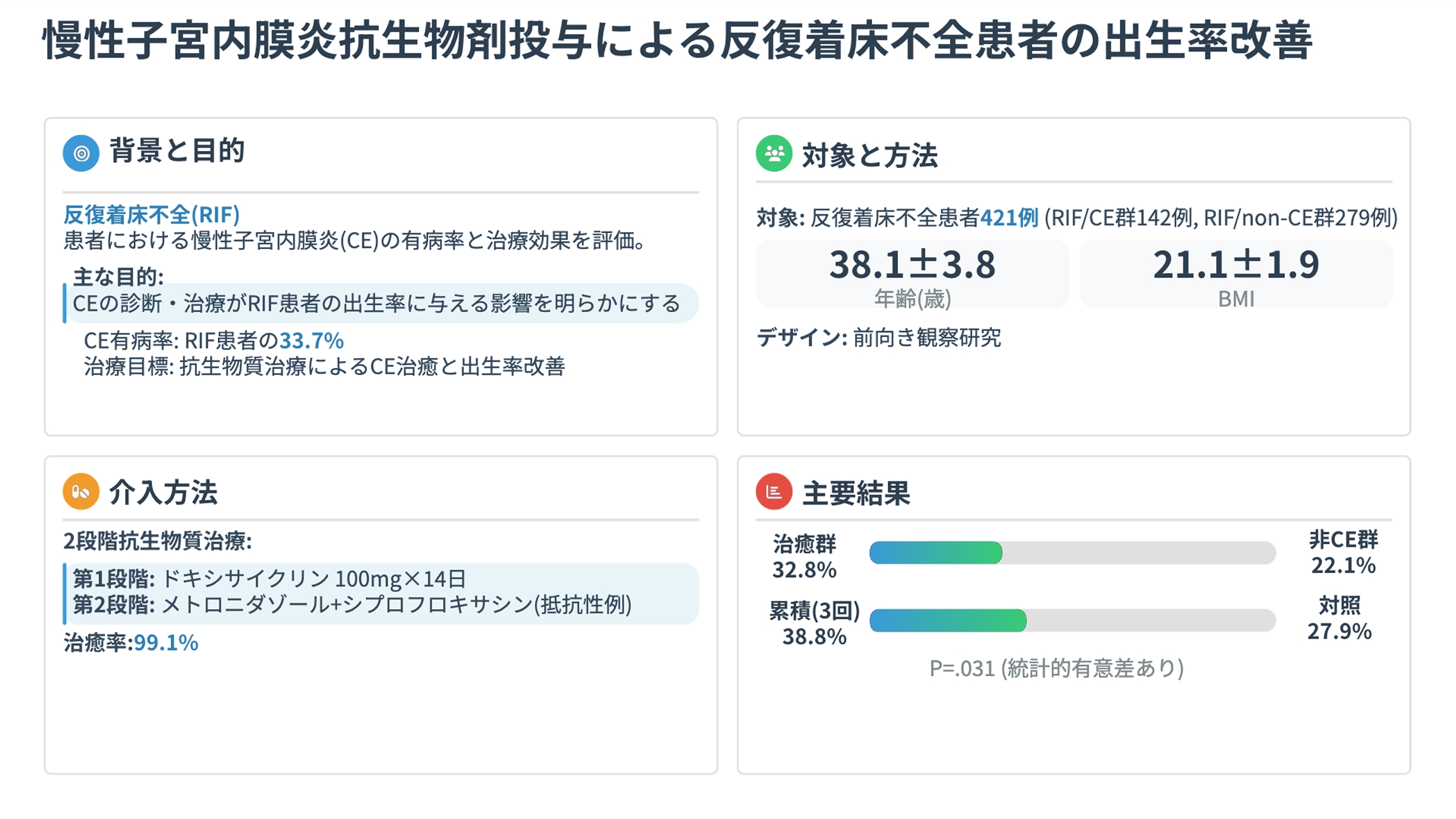 RIF女性の約1/3にCEが検出され、抗生剤によるCE治癒後の凍結融解胚盤胞移植では出生率が有意に改善(32.8% vs 22.1%)しました。