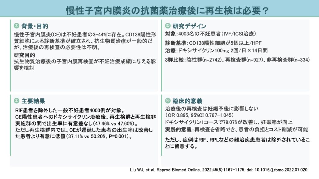 CE患者に対するドキシサイクリン治療後、再生検を行わずに胚移植を実施しても妊娠転帰に有意差はなく、治癒確認の省略が可能である可能性が示されました。