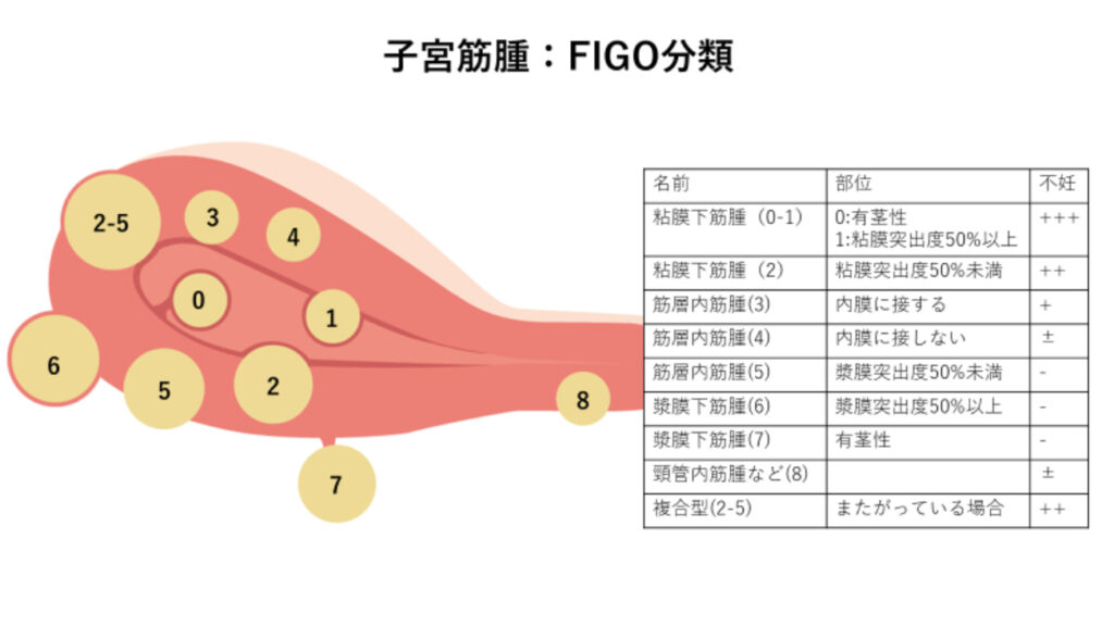 子宮筋腫は部位によって粘膜下、筋層内、漿膜下に分類されています。今日では、国際産科婦人科連合(FIGO)によって提案された詳細な分類が多用されます。