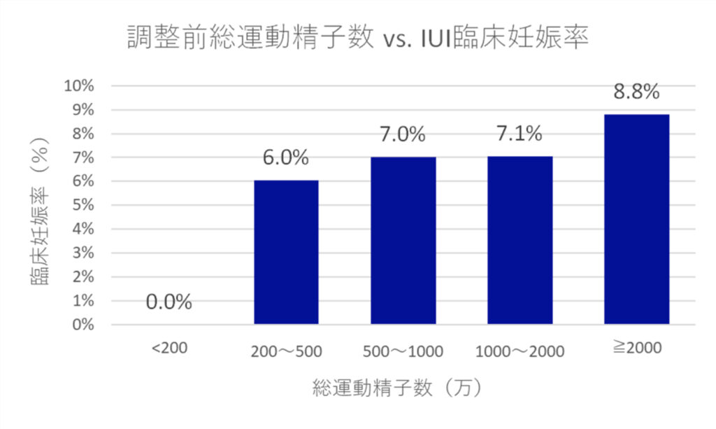 「調整前-総運動精子数」が900万以下、「調整後-総運動精子数」が200万以下の場合、妊娠例は認められませんでした。